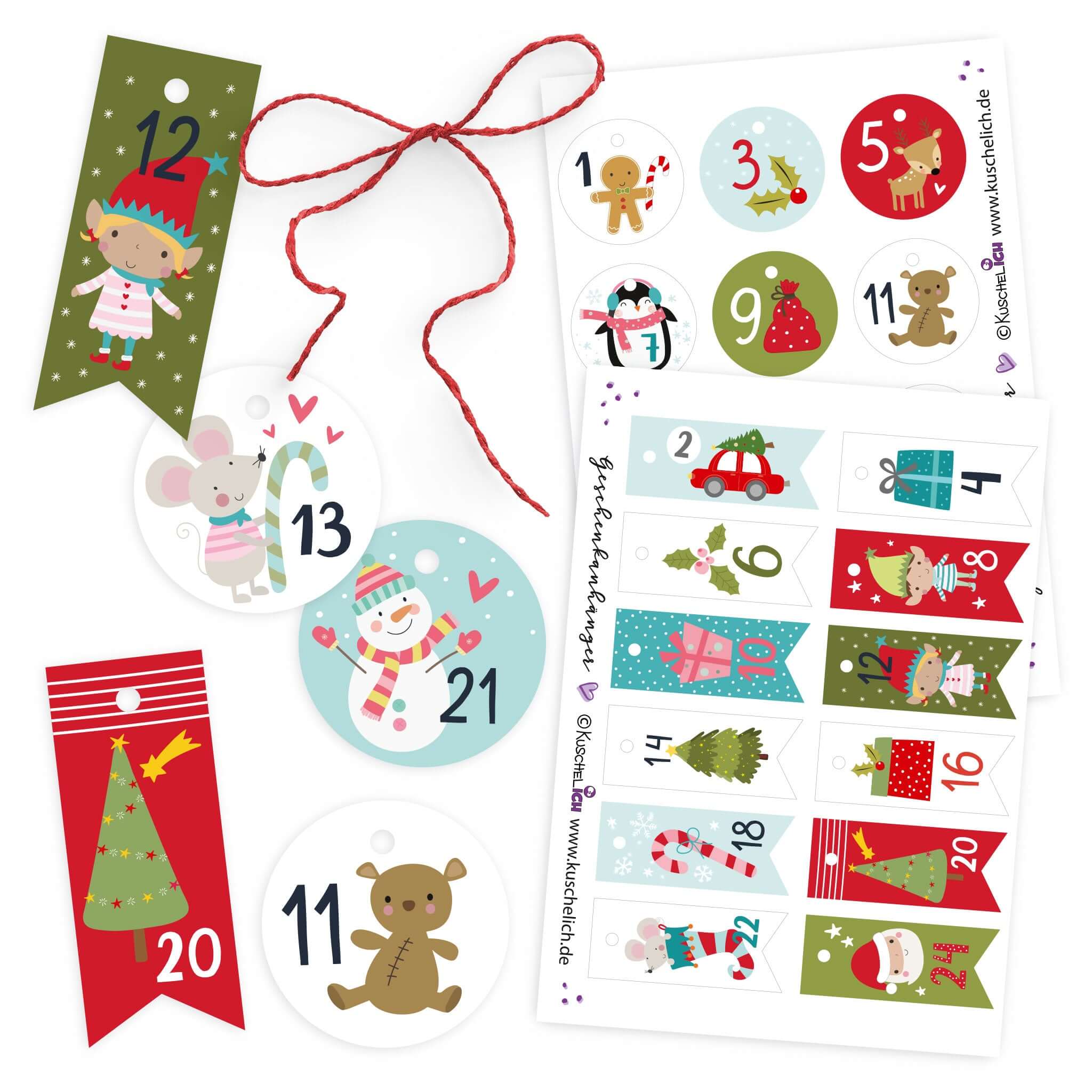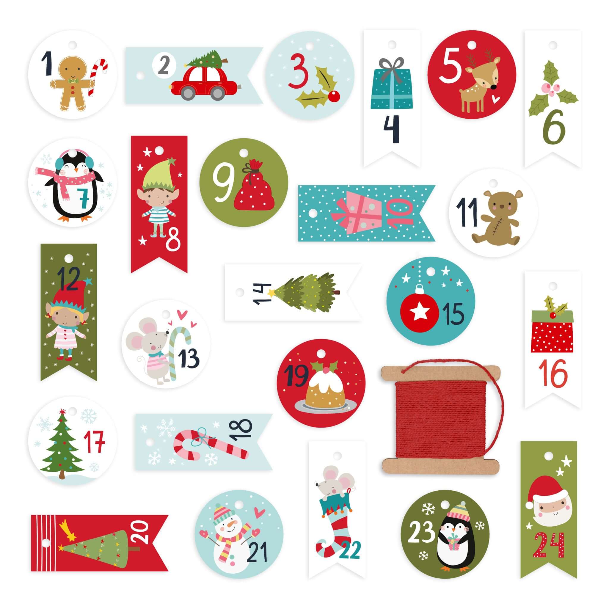 Adventskalender Zahlen Anhaenger Kinder – das 1–24 Set bringt fröhliche Illustrationen, stabile Zahlen-Anhänger und eine rote Kordel für deinen DIY-Countdown.