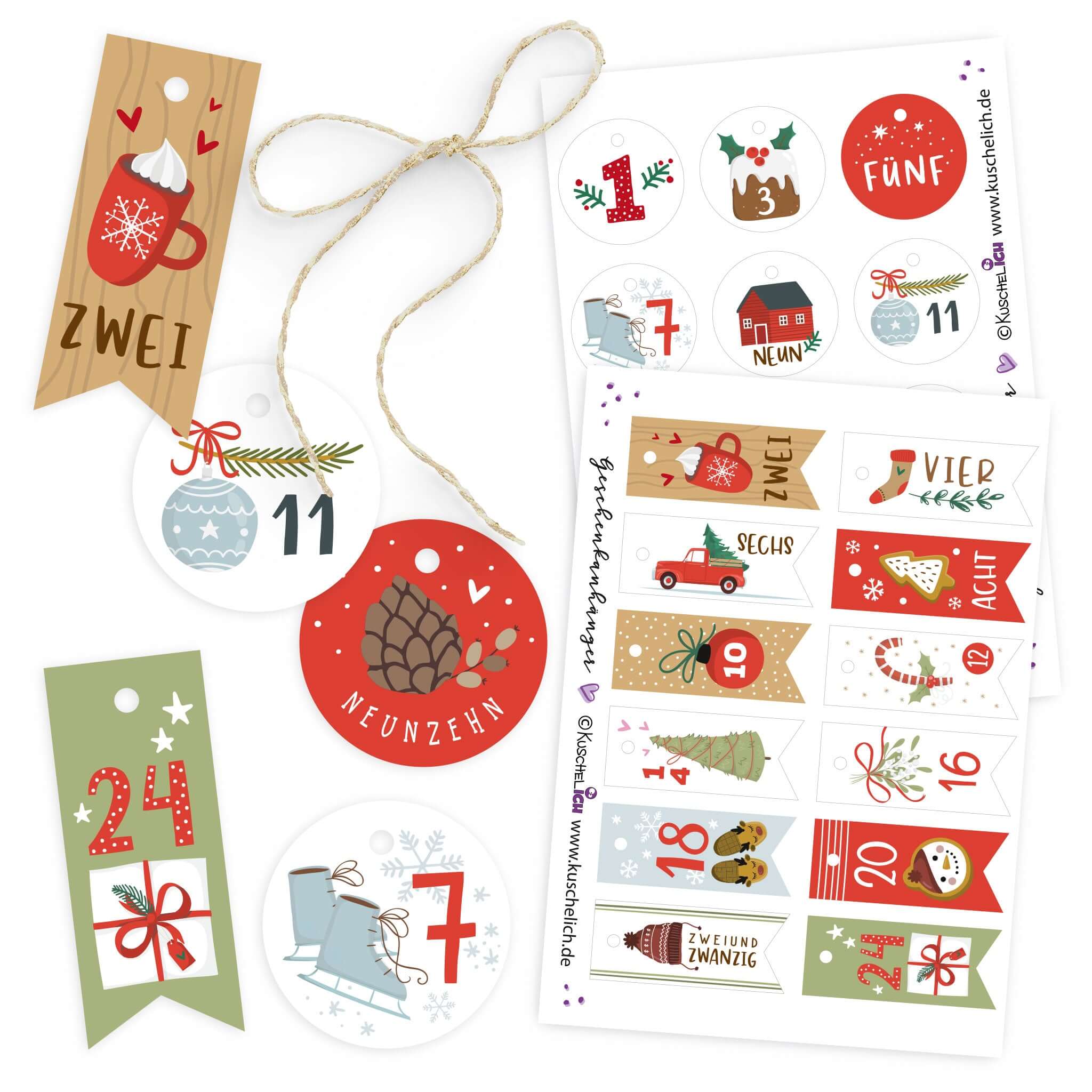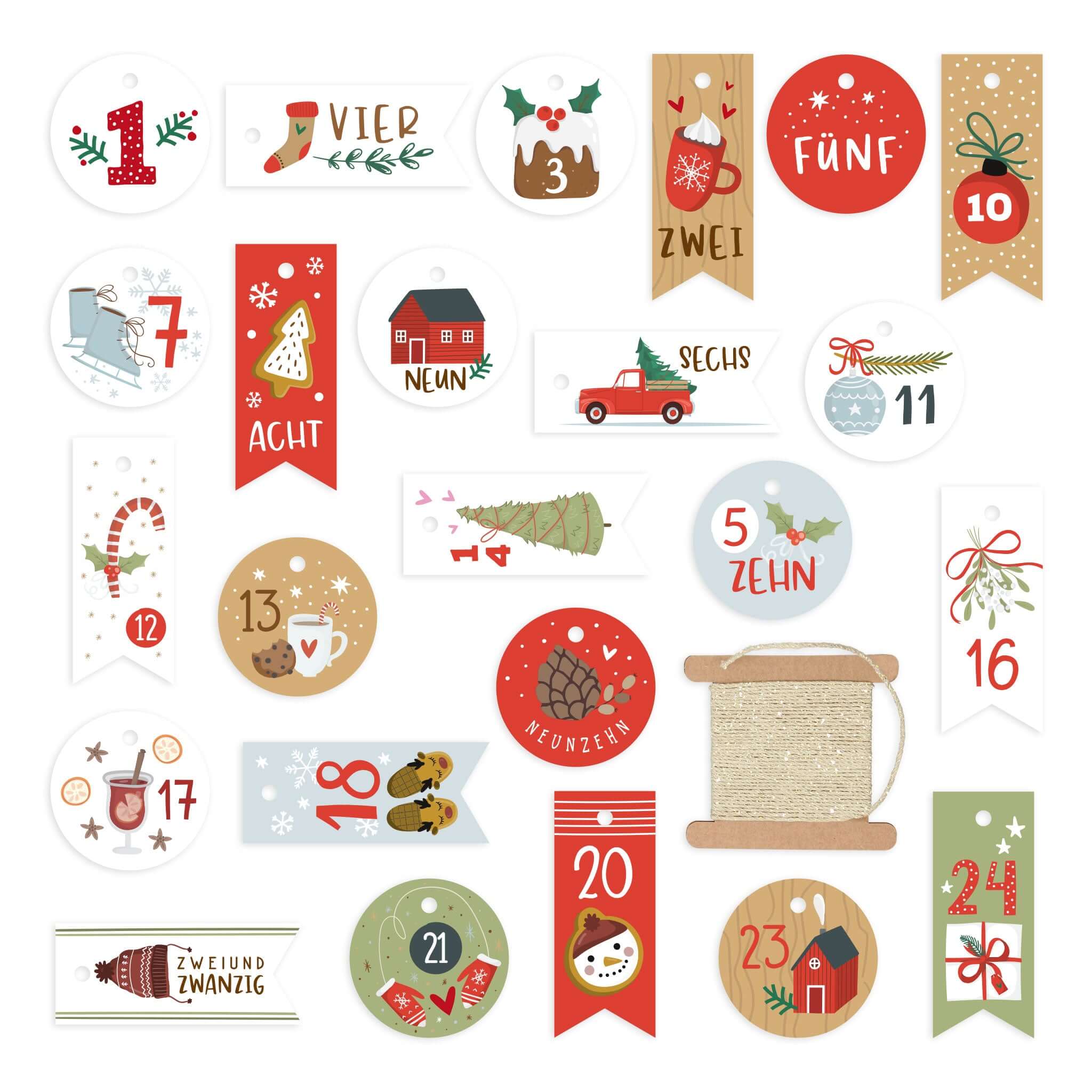 24 Zahlenanhänger (1–24) mit weihnachtlichen Illustrationen in Rot/Grün/Braun