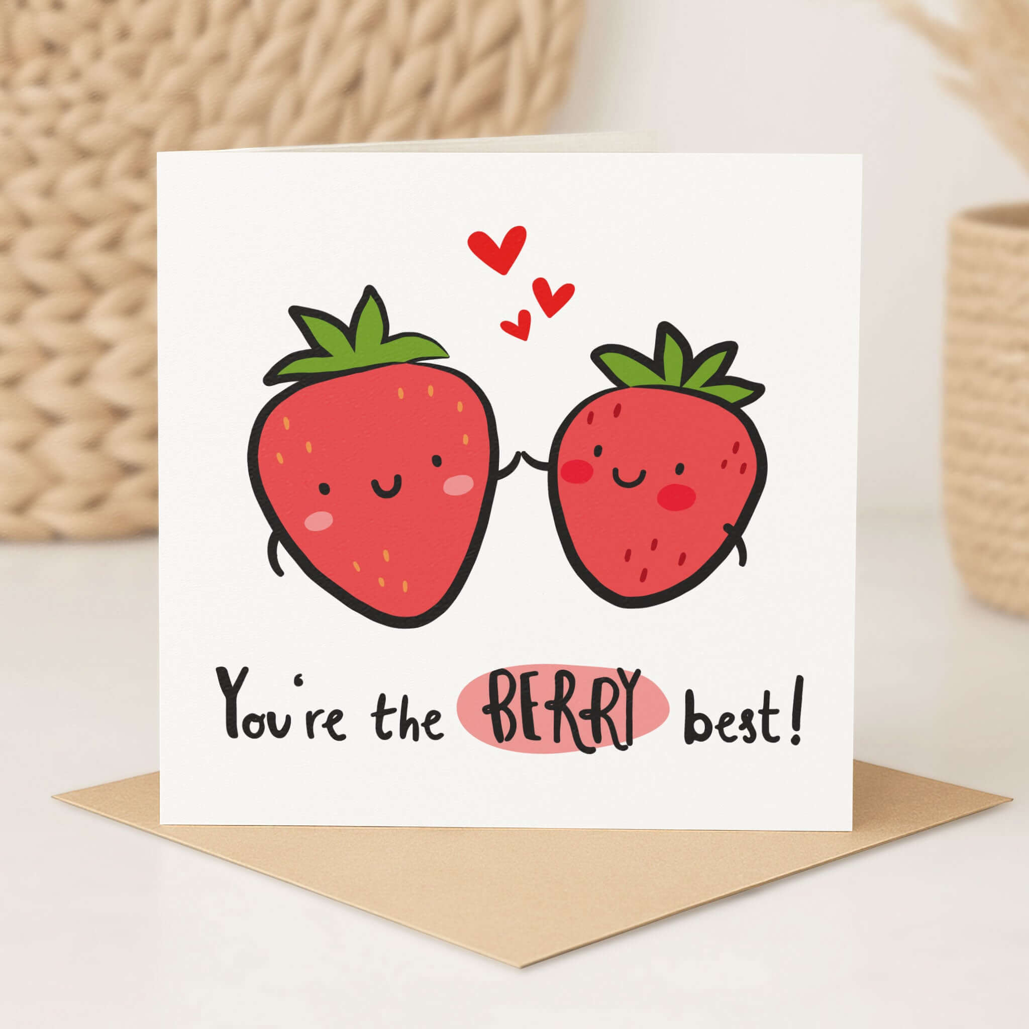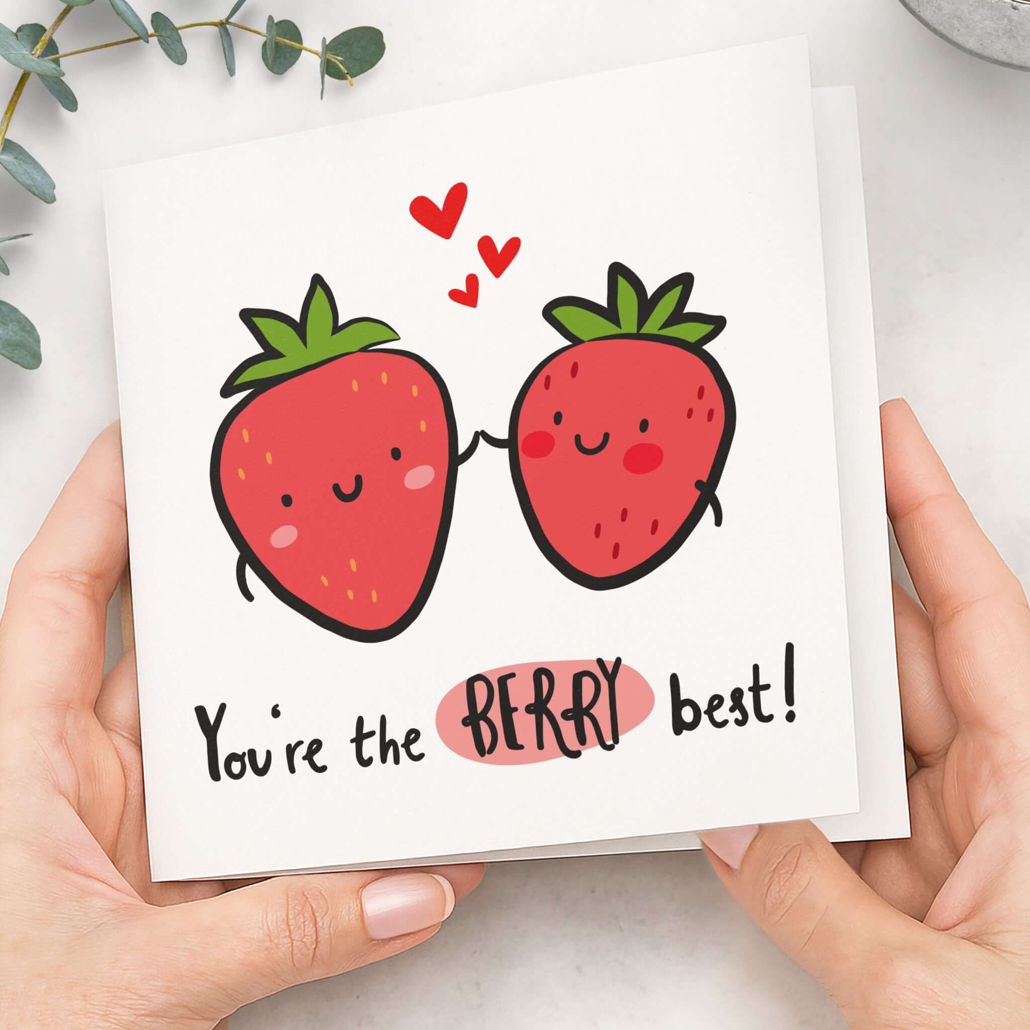 Herzmotiv: Zwei lächelnde Erdbeeren Hand in Hand mit dem Spruch “You’re the BERRY best!” – liebevoll & modern illustriert.