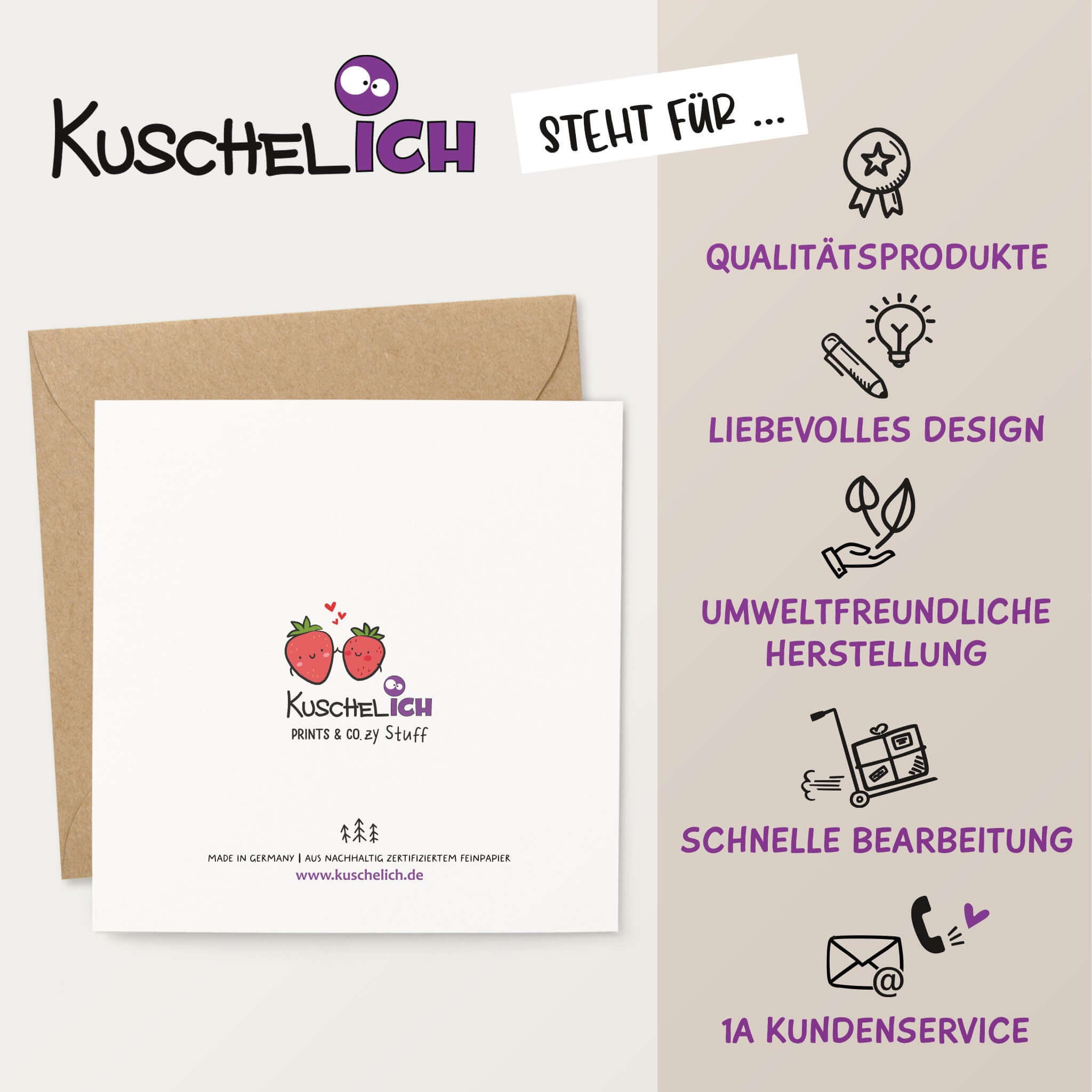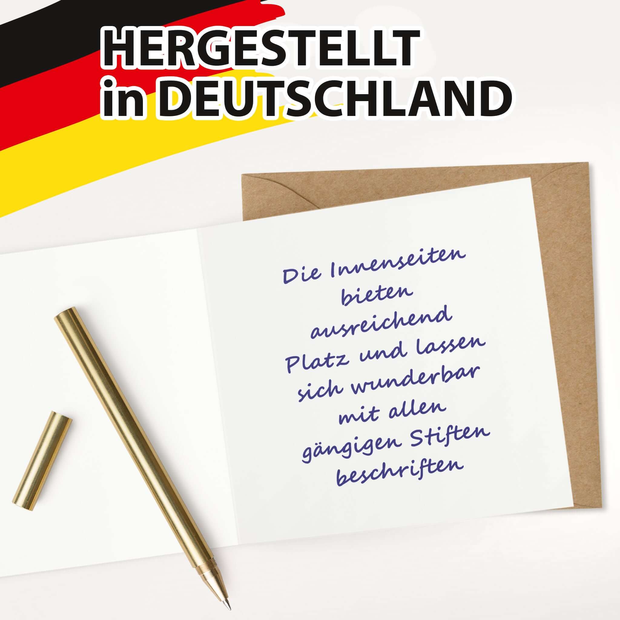 Die Innenseiten sind bewusst frei gelassen und bieten viel Platz für deine persönlichen Worte, kleine Zeichnungen oder eine Mini-Foto-Collage. Das Premiumpapier ist angenehm fest, fasst sich wertig an und lässt sich hervorragend mit Kugelschreiber, Füller oder Fineliner beschreiben. Der naturfarbene Kraftumschlag rundet das Geschenk harmonisch ab.