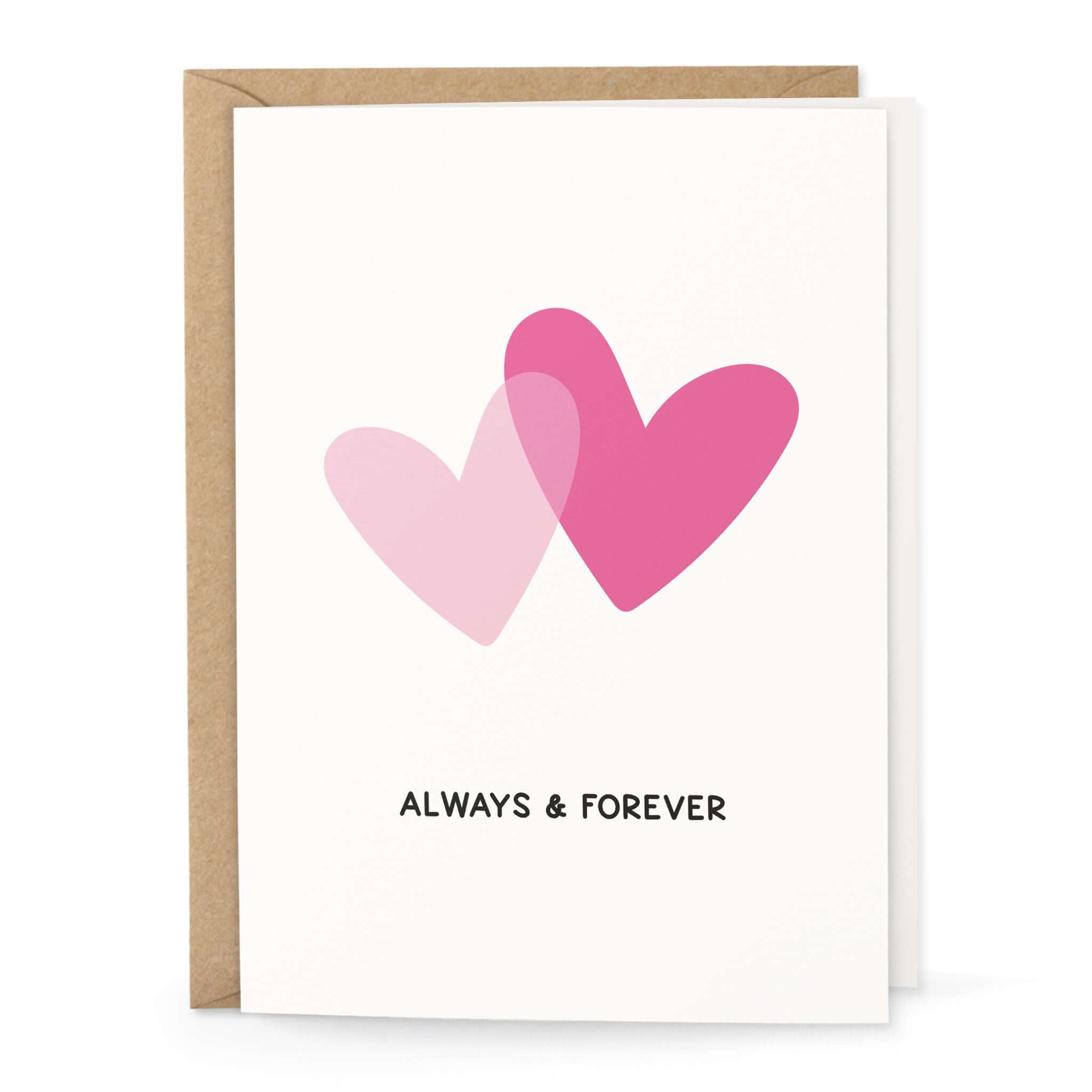 Sag „Always & Forever“ mit einer romantischen Grußkarte Herzen mit Umschlag, die deine Gefühle auf den Punkt bringt. Zwei ineinander verschlungene Herzen in Rosa und Pink symbolisieren Liebe, Zusammenhalt und Nähe – ein zeitloses Motiv, das zu vielen besonderen Anlässen passt.