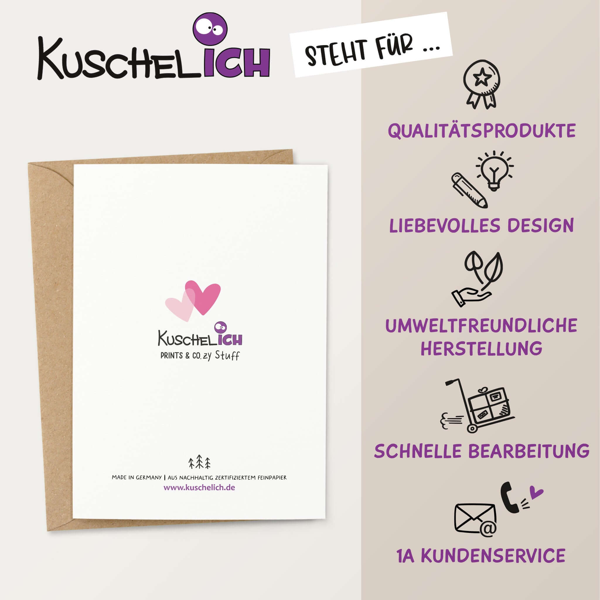 Die Grußkarte wird nachhaltig in Deutschland hergestellt. Verwendet wird stabiles Feinpapier, das für eine edle Optik und ein hochwertiges Schreibgefühl sorgt.
