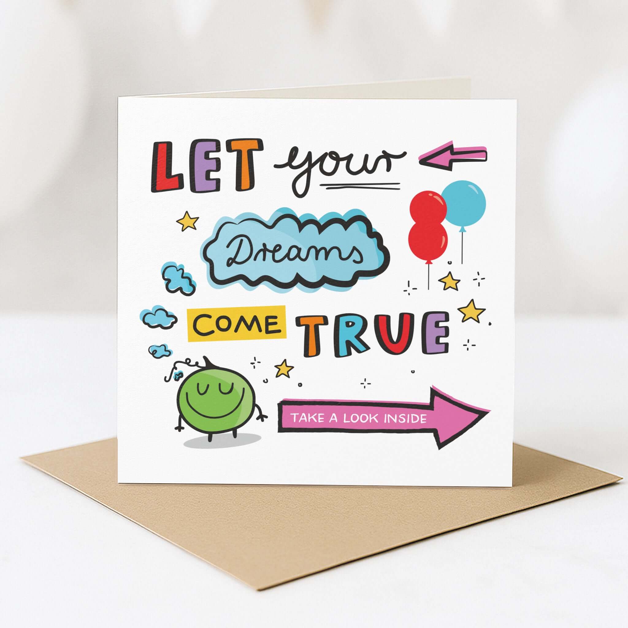 Diese farbenfrohe Klappkarte kombiniert liebevolle Illustrationen, kräftige Farben und eine klare Botschaft: Let your dreams come true. Perfekt, um Mut zu machen, jemanden zu motivieren oder besondere Glückwünsche zu übermitteln.